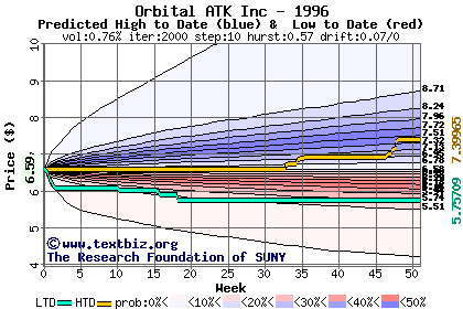 The high to date and low to date prices of the stock plotted against a random walk model for 1996 (what's this?).