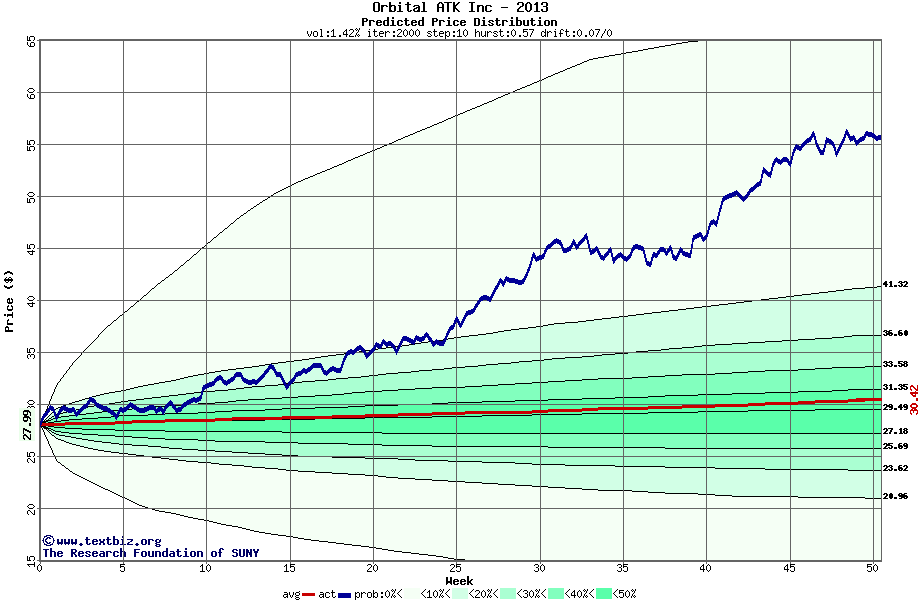 The following graph plots the year-to-date performance of the stock for 2013 compared to the probability calculated by a random walk model.