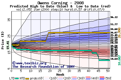 The high to date and low to date prices of the stock plotted against a random walk model for 2008 (what's this?).