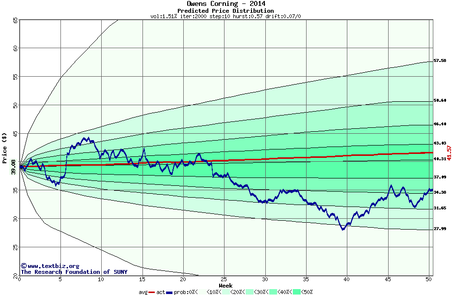 The following graph plots the year-to-date performance of the stock for 2014 compared to the probability calculated by a random walk model.