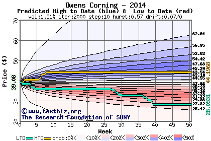 The high to date and low to date prices of the stock plotted against a random walk model for 2014 (what's this?).