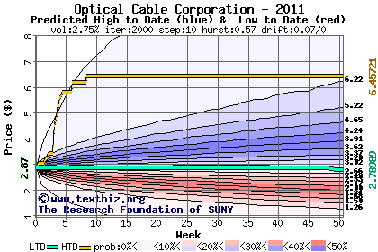 The high to date and low to date prices of the stock plotted against a random walk model for 2011 (what's this?).
