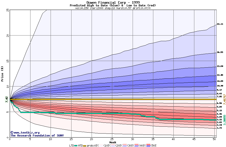 The high to date and low to date prices of the stock plotted against a random walk model for 1999 (what's this?).