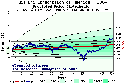 The high to date and low to date prices of the stock plotted against a random walk model for 2004 (what's this?).