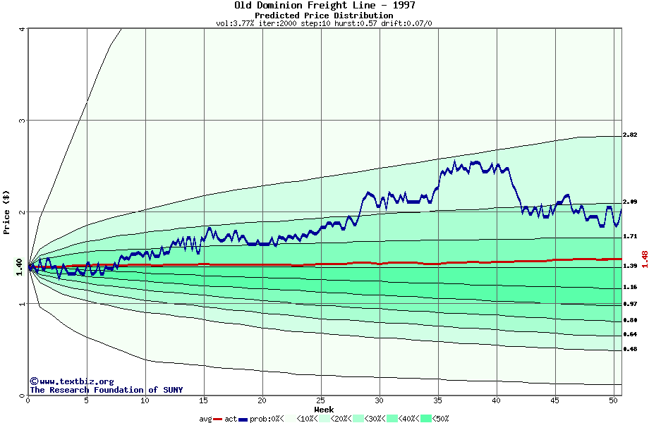 The following graph plots the year-to-date performance of the stock for 1997 compared to the probability calculated by a random walk model.