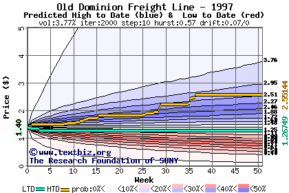The high to date and low to date prices of the stock plotted against a random walk model for 1997 (what's this?).