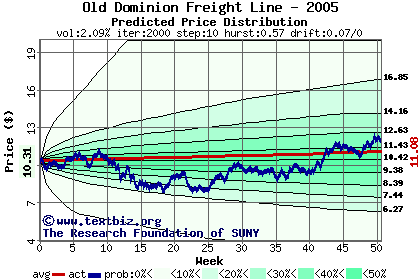 The following graph plots the year-to-date performance of the stock for 2005 compared to the probability calculated by a random walk model.