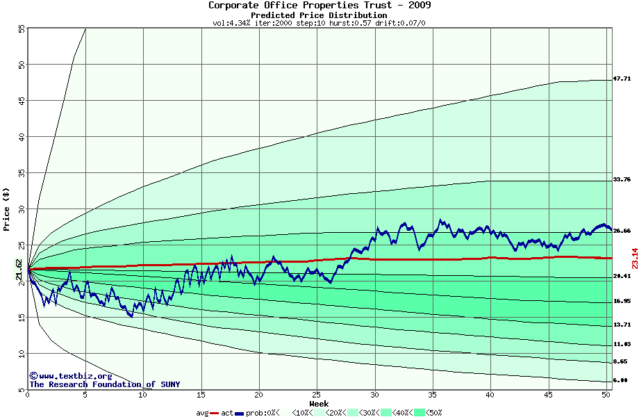 The following graph plots the year-to-date performance of the stock for 2009 compared to the probability calculated by a random walk model.