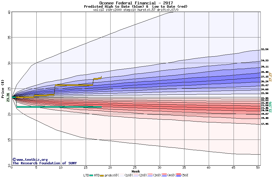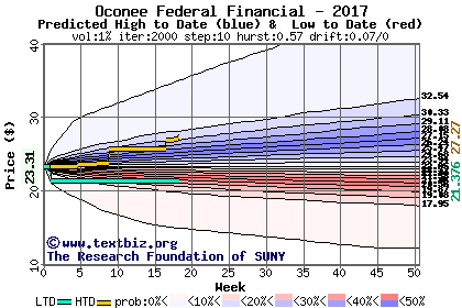 The high to date and low to date prices of the stock plotted against a random walk model for 2017 (what's this?).
