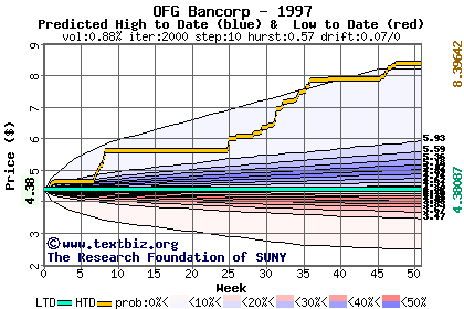 The high to date and low to date prices of the stock plotted against a random walk model for 1997 (what's this?).
