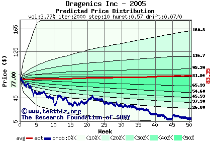 The following graph plots the year-to-date performance of the stock for 2005 compared to the probability calculated by a random walk model.