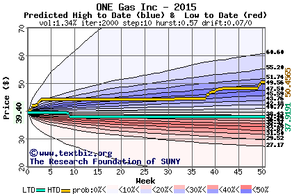 The high to date and low to date prices of the stock plotted against a random walk model for 2015 (what's this?).