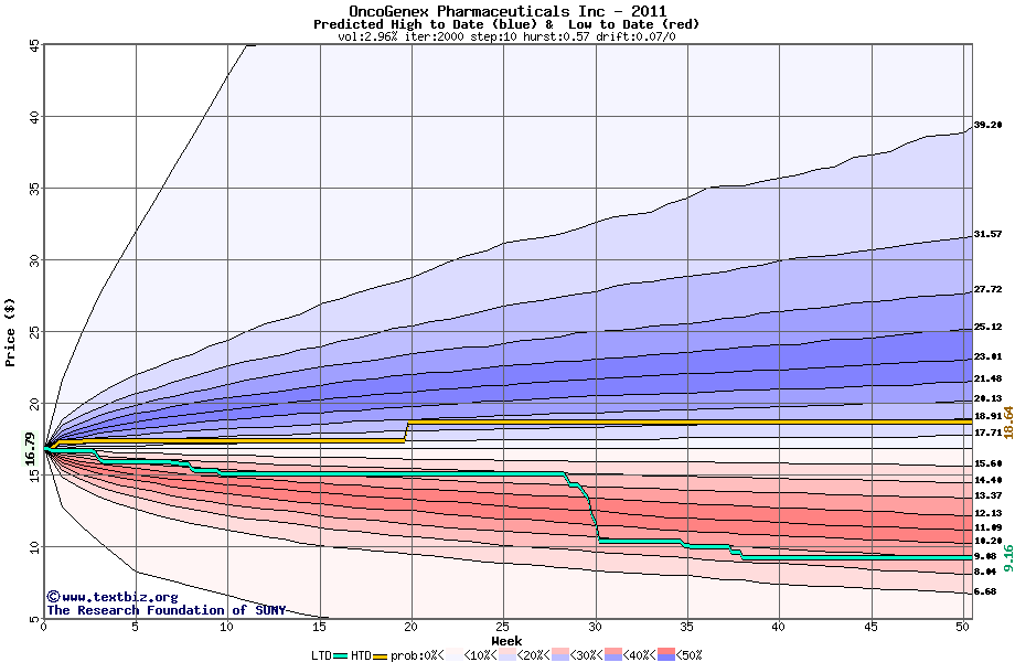 The high to date and low to date prices of the stock plotted against a random walk model for 2011 (what's this?).