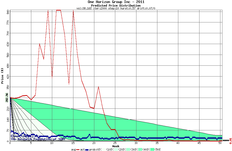 The high to date and low to date prices of the stock plotted against a random walk model for 2011 (what's this?).