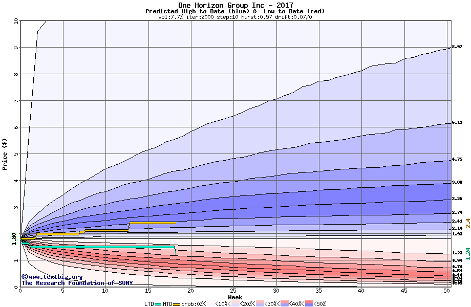 The high to date and low to date prices of the stock plotted against a random walk model for 2017 (what's this?).