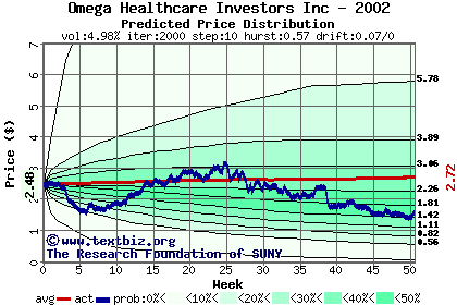 The high to date and low to date prices of the stock plotted against a random walk model for 2002 (what's this?).