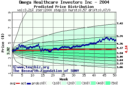 The high to date and low to date prices of the stock plotted against a random walk model for 2004 (what's this?).