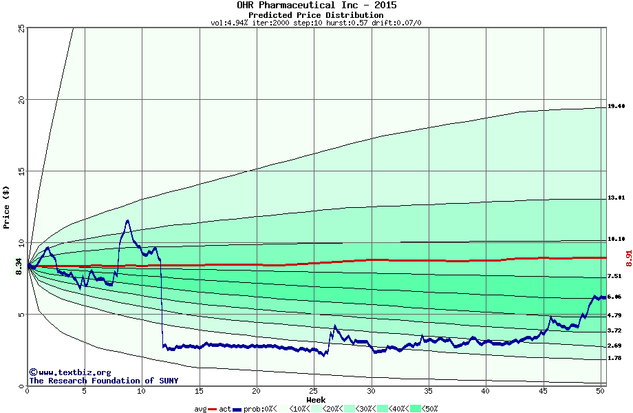 The following graph plots the year-to-date performance of the stock for 2015 compared to the probability calculated by a random walk model.