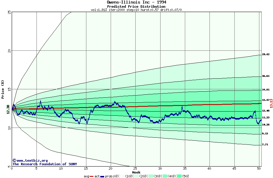 The following graph plots the year-to-date performance of the stock for 1994 compared to the probability calculated by a random walk model.