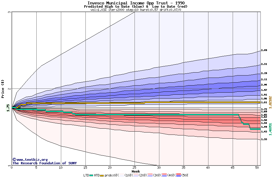 The high to date and low to date prices of the stock plotted against a random walk model for 1990 (what's this?).
