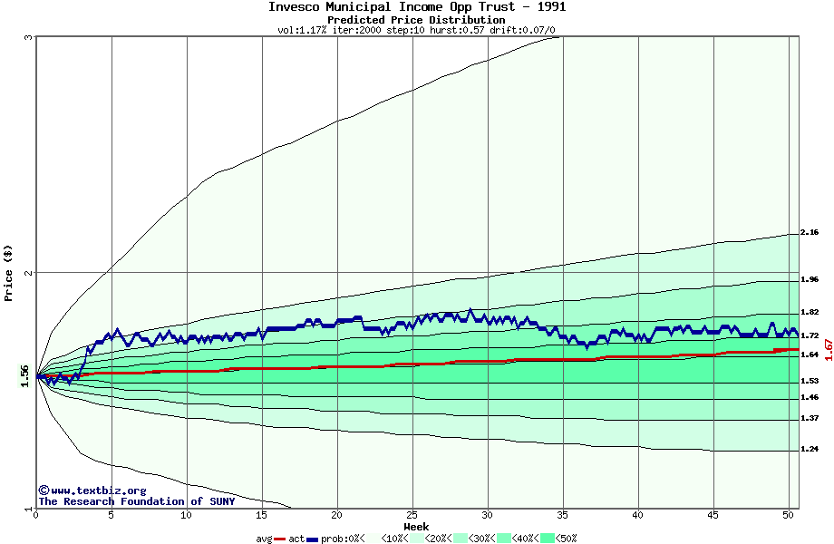 The high to date and low to date prices of the stock plotted against a random walk model for 1991 (what's this?).