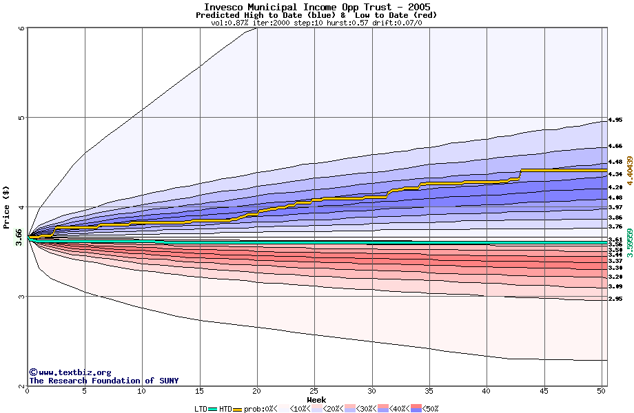 The high to date and low to date prices of the stock plotted against a random walk model for 2005 (what's this?).