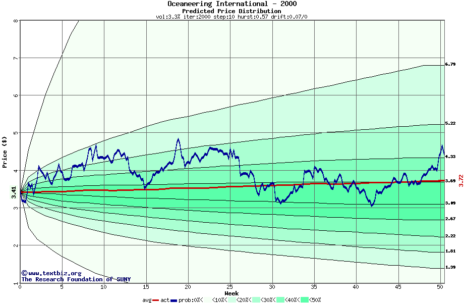 The high to date and low to date prices of the stock plotted against a random walk model for 2000 (what's this?).