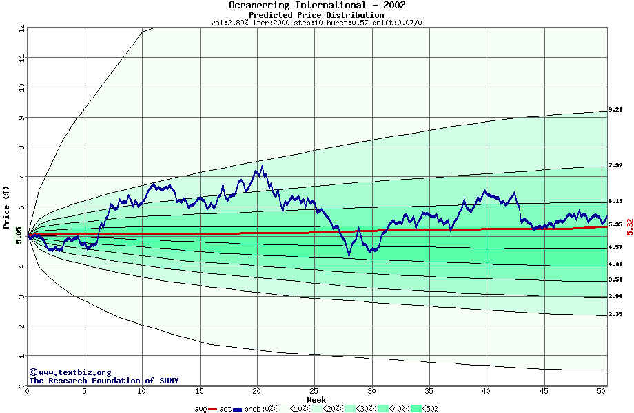 The following graph plots the year-to-date performance of the stock for 2002 compared to the probability calculated by a random walk model.