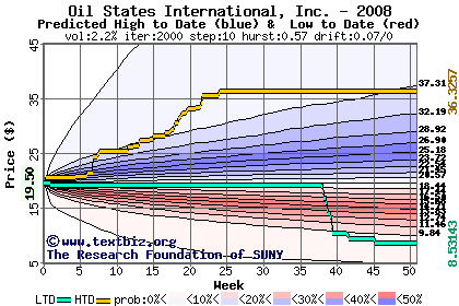 The high to date and low to date prices of the stock plotted against a random walk model for 2008 (what's this?).