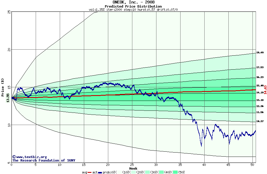 The following graph plots the year-to-date performance of the stock for 2008 compared to the probability calculated by a random walk model.