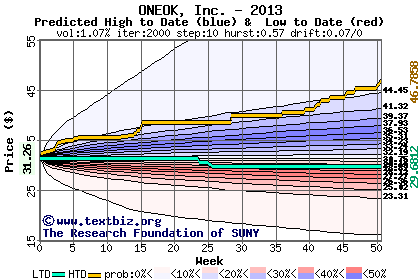 The high to date and low to date prices of the stock plotted against a random walk model for 2013 (what's this?).