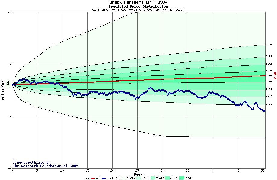 The following graph plots the year-to-date performance of the stock for 1994 compared to the probability calculated by a random walk model.