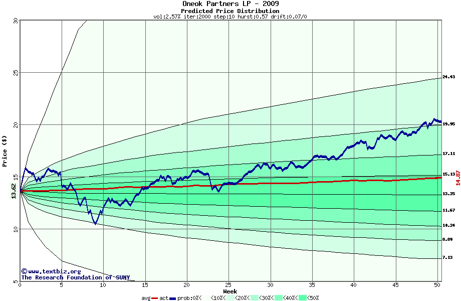 The following graph plots the year-to-date performance of the stock for 2009 compared to the probability calculated by a random walk model.