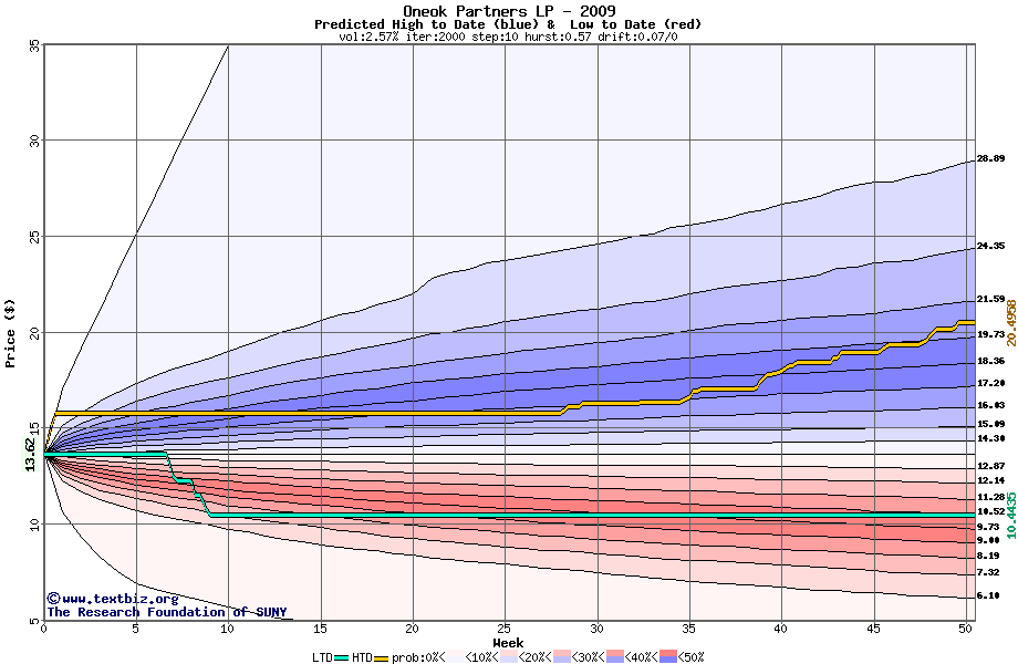 The high to date and low to date prices of the stock plotted against a random walk model for 2009 (what's this?).
