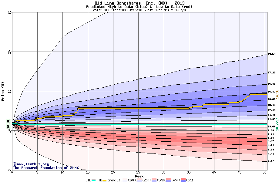 The high to date and low to date prices of the stock plotted against a random walk model for 2013 (what's this?).