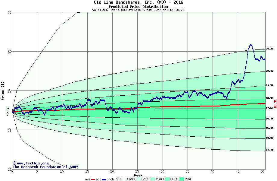The following graph plots the year-to-date performance of the stock for 2016 compared to the probability calculated by a random walk model.