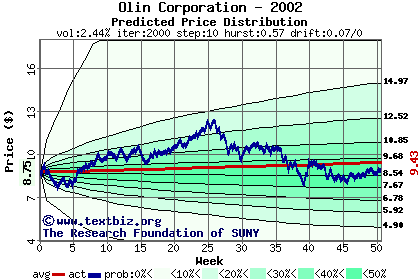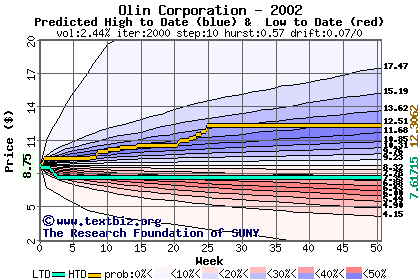 The high to date and low to date prices of the stock plotted against a random walk model for 2002 (what's this?).