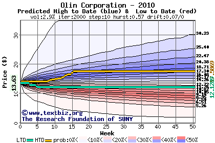 The high to date and low to date prices of the stock plotted against a random walk model for 2010 (what's this?).