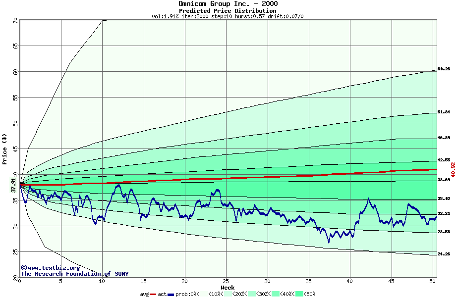 The following graph plots the year-to-date performance of the stock for 2000 compared to the probability calculated by a random walk model.