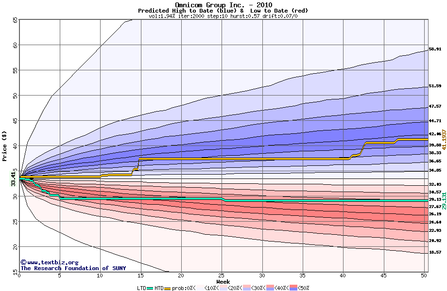 The high to date and low to date prices of the stock plotted against a random walk model for 2010 (what's this?).