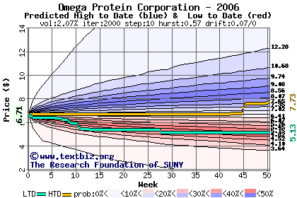 The high to date and low to date prices of the stock plotted against a random walk model for 2006 (what's this?).