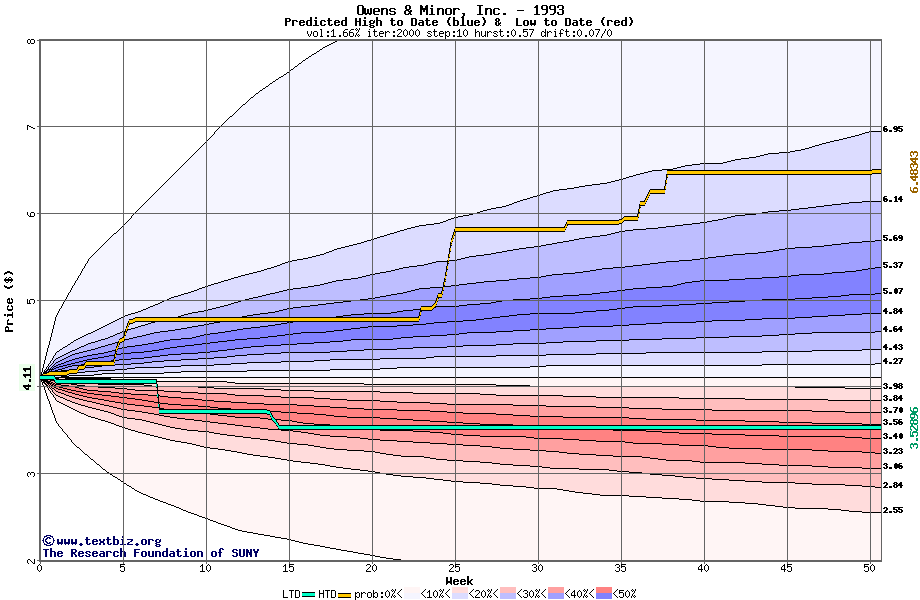 The high to date and low to date prices of the stock plotted against a random walk model for 1993 (what's this?).