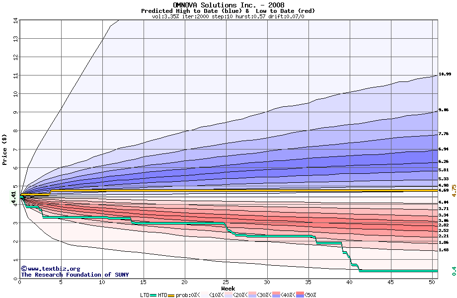 The high to date and low to date prices of the stock plotted against a random walk model for 2008 (what's this?).