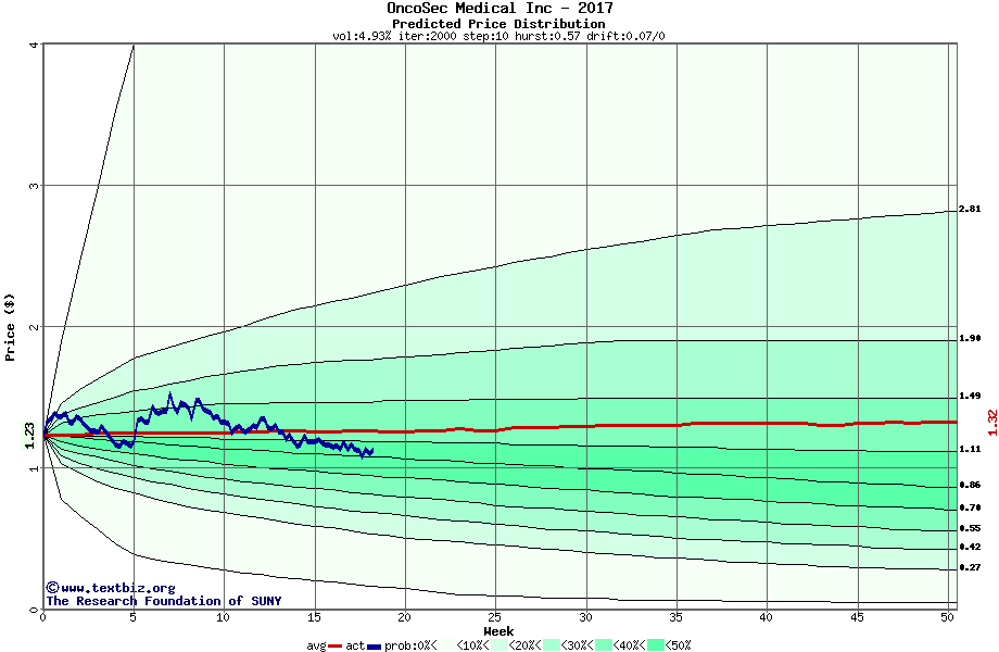 The following graph plots the year-to-date performance of the stock for 2017 compared to the probability calculated by a random walk model.