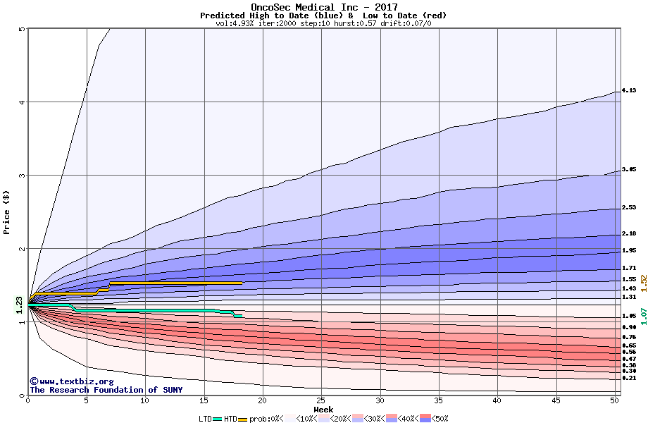 The high to date and low to date prices of the stock plotted against a random walk model for 2017 (what's this?).