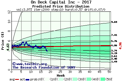 The high to date and low to date prices of the stock plotted against a random walk model for 2017 (what's this?).