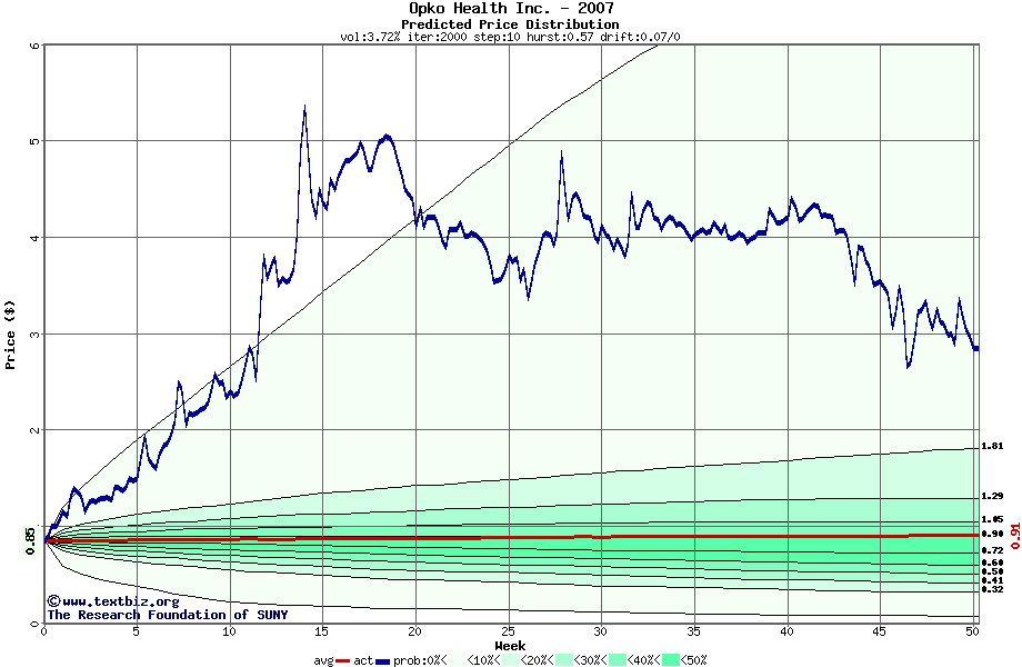 The high to date and low to date prices of the stock plotted against a random walk model for 2007 (what's this?).