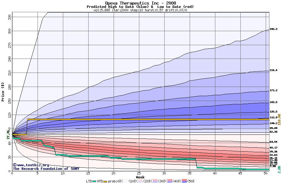 The high to date and low to date prices of the stock plotted against a random walk model for 2008 (what's this?).