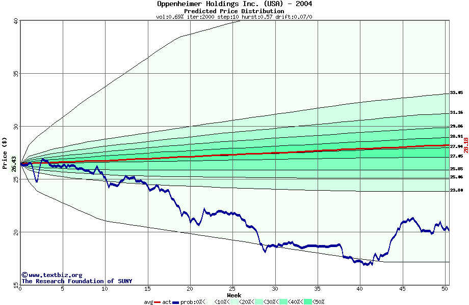 The following graph plots the year-to-date performance of the stock for 2004 compared to the probability calculated by a random walk model.