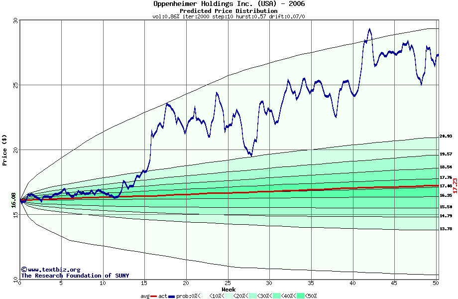 The following graph plots the year-to-date performance of the stock for 2006 compared to the probability calculated by a random walk model.